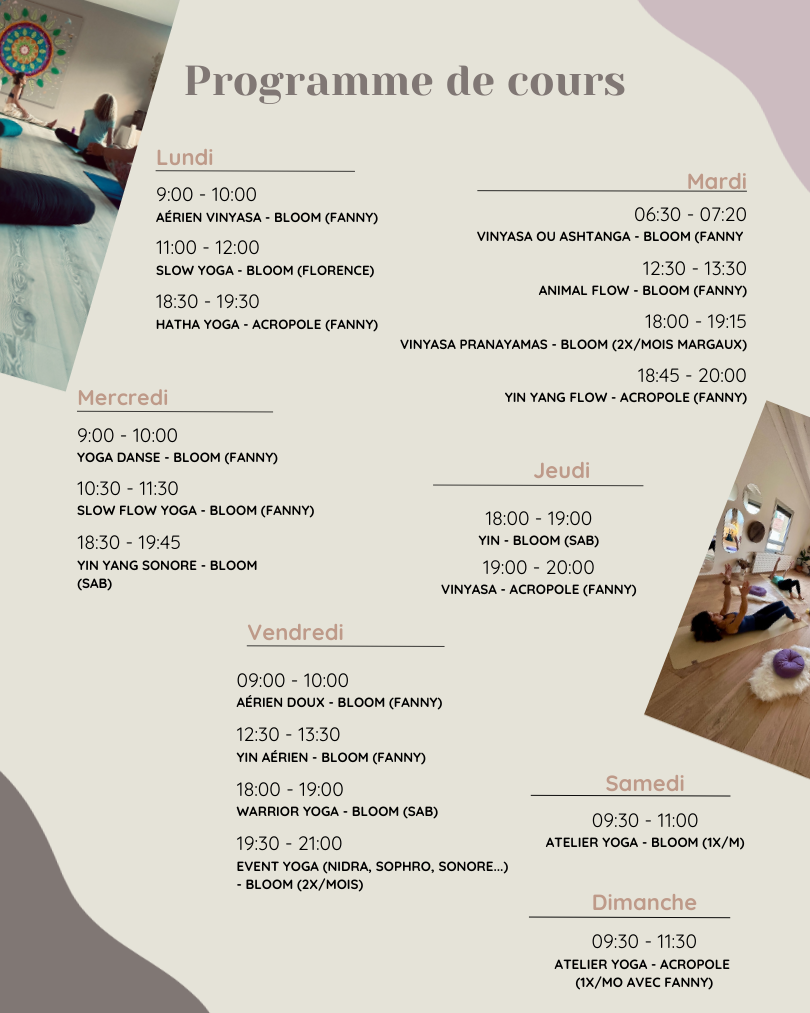 • Fermeture de la salle de yoga durant les 2 semaines de vacances d’hiver et les deuxièmes semaines des vacances scolaires.